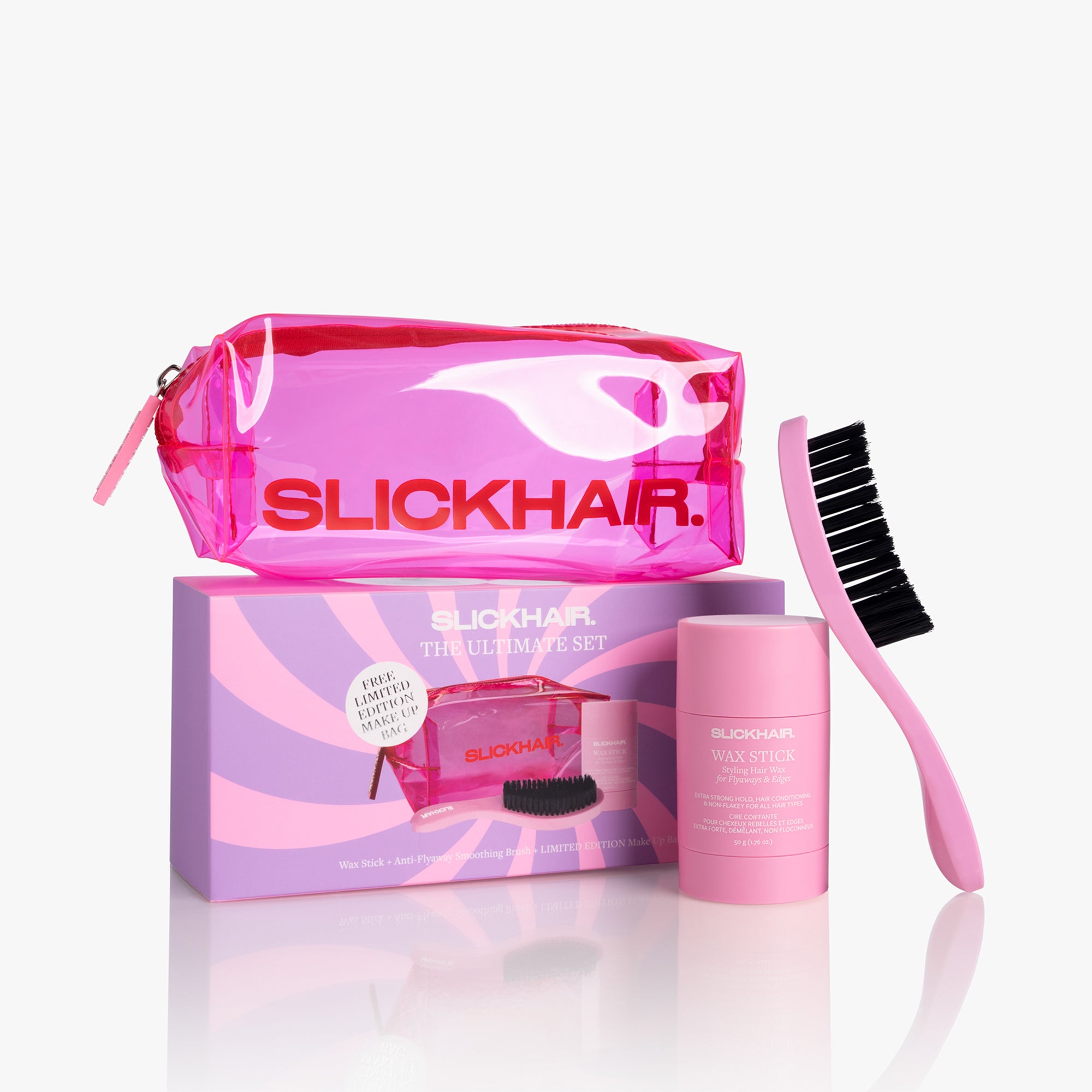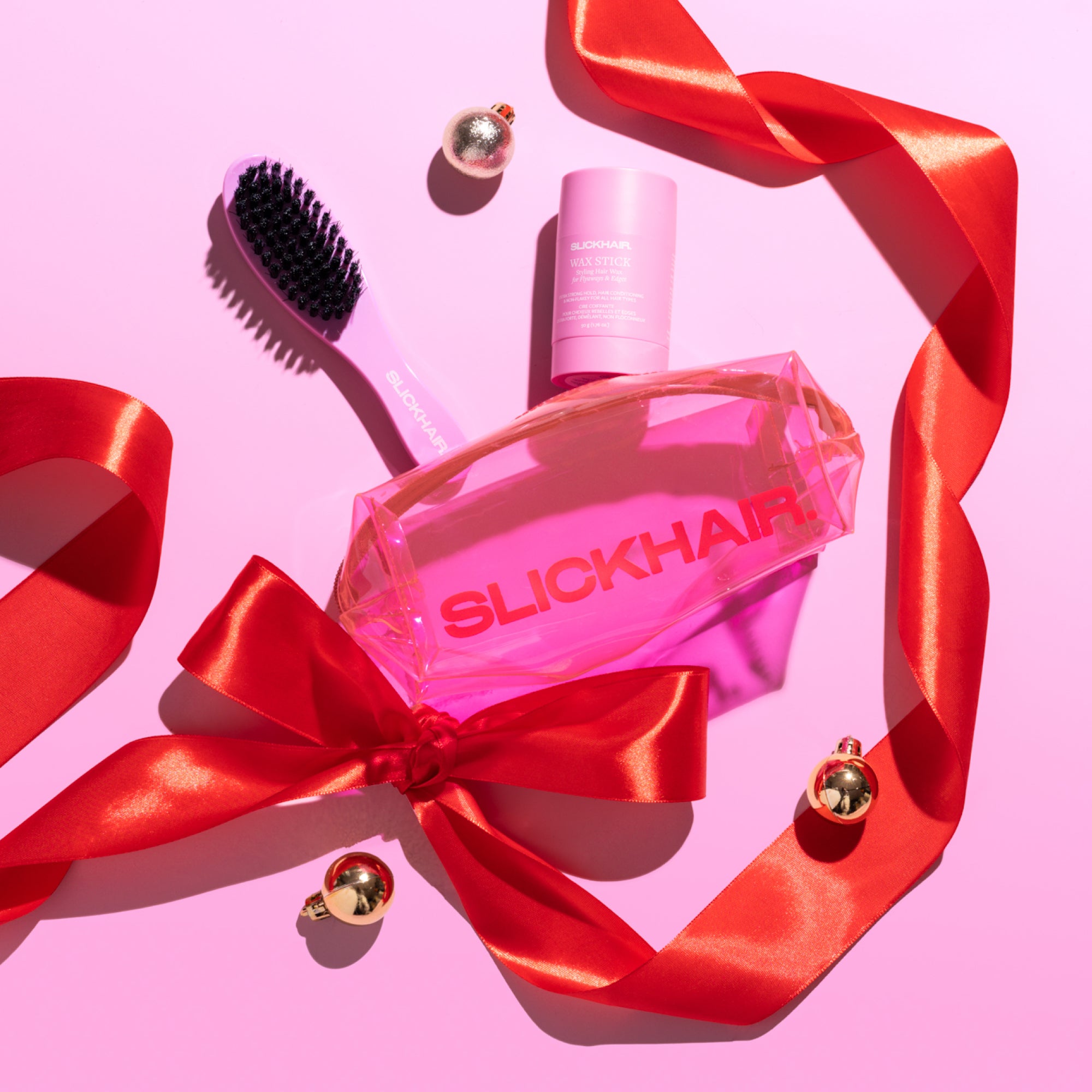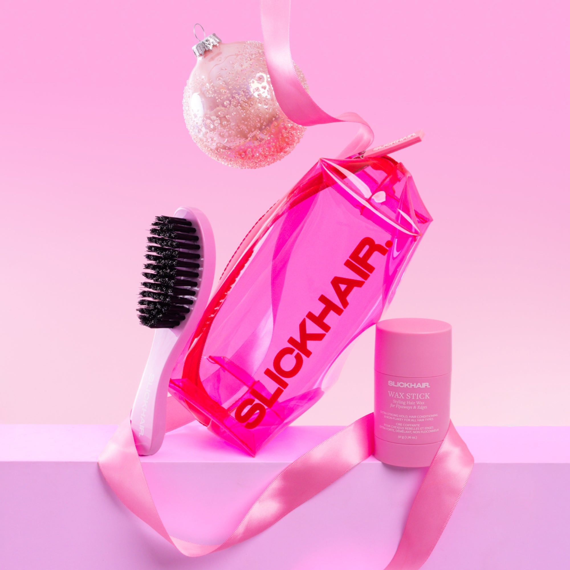 Unwrap your sleekest holiday season yet with the SLICKHAIR Holiday Ultimate Cracker Set – the perfect gift for lovers of polished, flyaway-free hair. This limited-edition festive cracker includes a mini anti-flyaway Smoothing Brush and the extra-strong hold Wax Stick, plus an exclusive limited edition makeup bag to keep your hair tools close (and cute).