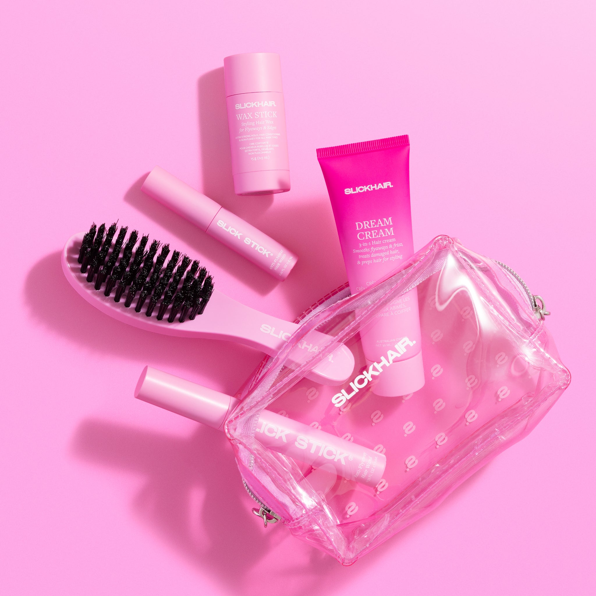 Meet your new go-to for on-the-go touch-ups. Our limited-edition clear PVC travel case keeps your essentials organised and travel-ready, finished with our exclusive SLICKHAIR design and signature ‘S’ logo pull tab. Compact yet spacious, it’s perfectly sized to fit your daily favourites - from your SLICK STICK® to your smoothing brush.